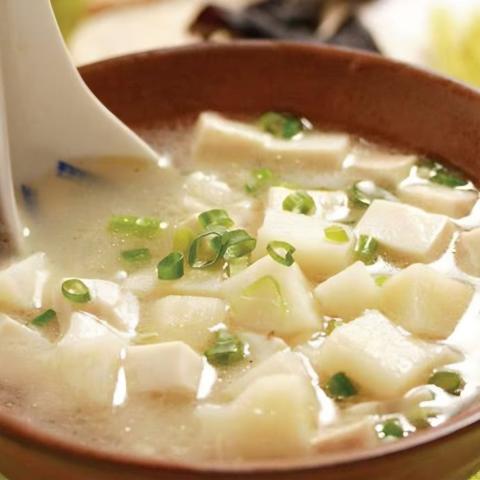 -저지방·고영양의 건강식으로, 산약은 익히면 부드럽고 가루 같은 식감을 내고, 두부는 매끈하고 연한 질감을 더해 식감 대비가 조화를 이룸.