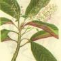 Las hojas son alternas, coriáceas, ovado-oblongas o ovadas, de siete a nueve centímetros de largo (hasta doce), dos punto cinco a tres punto cinco centímetros de ancho (hasta cinco).
