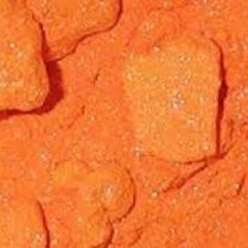 Se presenta en forma de cristales laminares o en polvo de color rojo anaranjado. En las láminas, una cara es relativamente lisa y ligeramente brillante, mientras que la otra es más rugosa. El polvo es de color anaranjado. Es duro y quebradizo, inodoro. Al exponerse a la luz, el color se oscurece gradualmente.